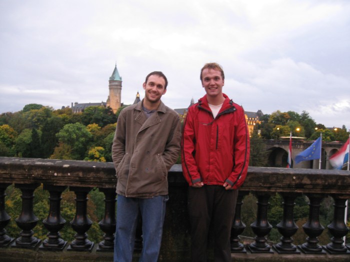 After leaving Bruges at noon my next stop was to see my cousin Brian and his wife Jeza in Luxembourg City. I hadn’t seen Brian for 8 years or so, but I immediately recognized him at the train stop. It’s always exciting to see family, especially when it has been a long time. Soon after I met Jeza, his wife, who is a wonderful French woman with a super bubbly personality. It was great catching up with them, and they even bought me a huge French dinner and gave me a couch to sleep on. I can’t even describe how grateful I was, so all I can say, for the hundredth time, is thanks Brian and Jeza! You two know how to show a good time. Here is a picture of the two in front of the building where Jeza works.