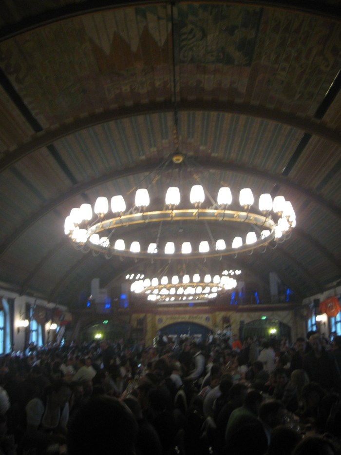 After an hour of waiting outside I finally arrived inside, where hops hung from the ceiling, the men wore suspenders, and the beer came in liter mugs.