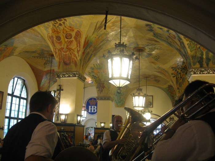 After watching the daily noon joust at the Glockenspiel, I stopped to get some postcards at a street vendor, where a man in his 40’s came and asked me “Sprechen zie English?” I looked at him, and looked at the postcards, and thought “Wow, was that a dead giveaway?” Anyhow, he and two friends were looking for the Häufbrauhaus, which was where I was on my way to, so we went together. The man was named Steve and worked for Thompson Elite in LA and his friends worked for Cisco Systems in Minnesota. They were super nice guys and even bought my beers at the Häufbrauhaus. (A hint for the young traveler- as I learned here and at de Garre in Bruges, always be super nice to anyone who is older than you because they will usually buy the beer, as well as be super nice to you back. Plus, you never know who you might meet and make connections with). If you guys find this post thanks again for the brews!