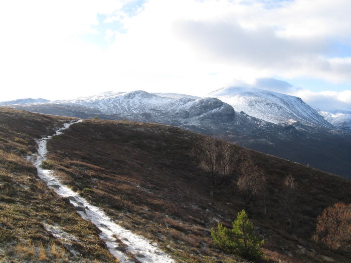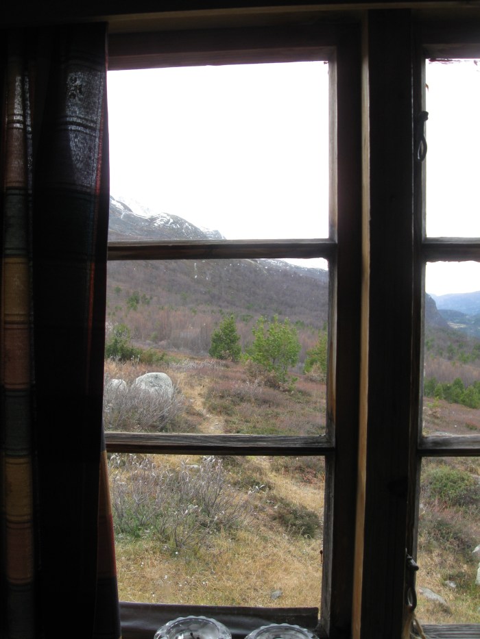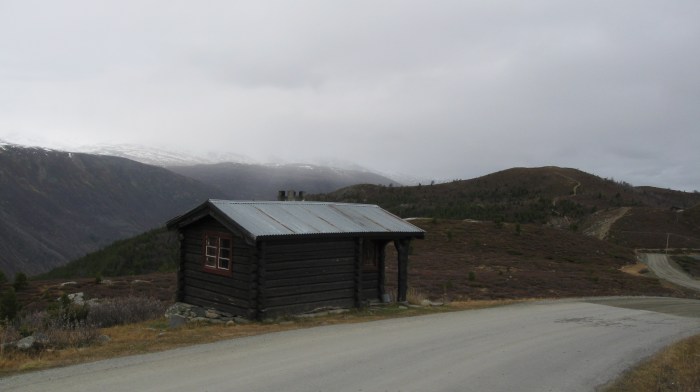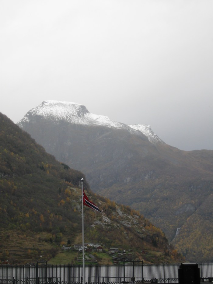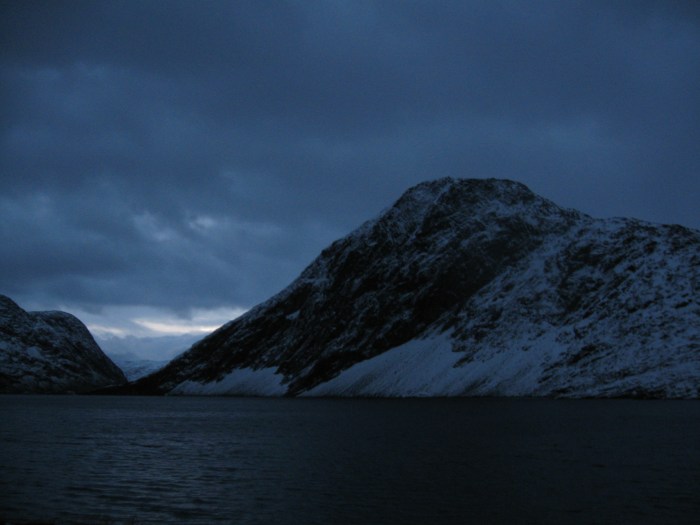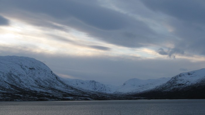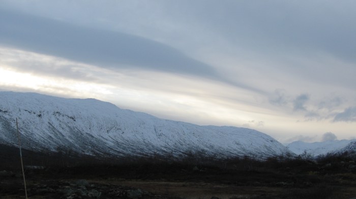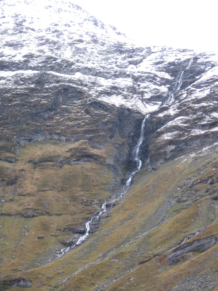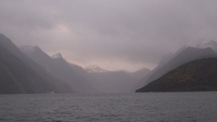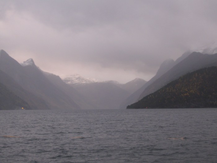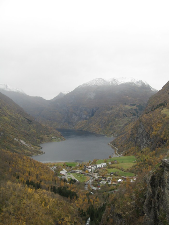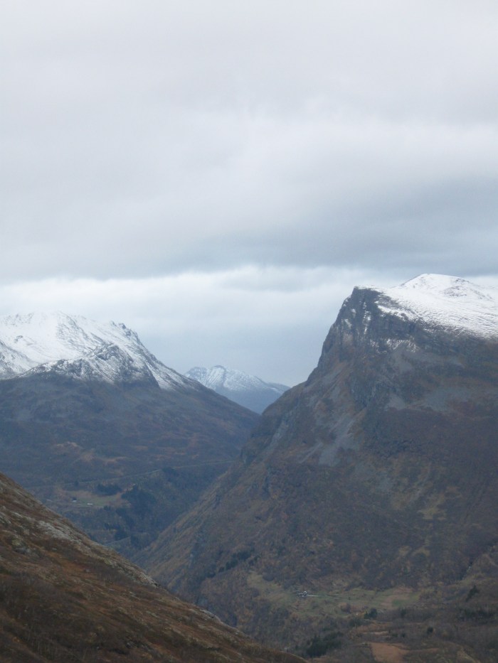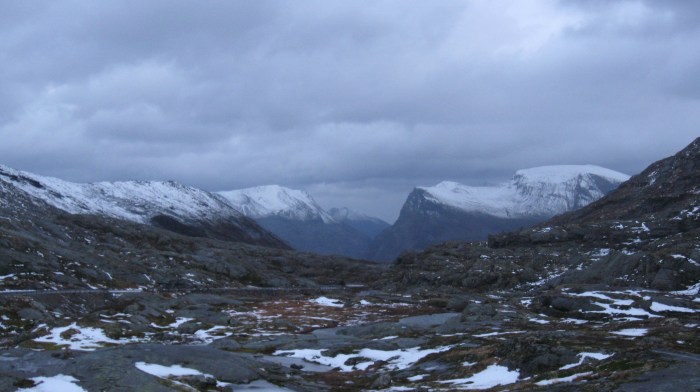After walking a ways, I came to a sign that told me Geiranger was a little more than “just down the road.” It was 37 km, actually, or about 22 miles. Once again, however, it wasn’t long before someone stopped to give me a ride. This time it was a Russian truck driver who spoke Norwegian, German, and not a word of English. When I told him I spoke French he tried to speak it but I couldn’t understand anything he said except “Vous.” Anyhow, he dropped me off at the intersection I needed, and I only had about 30 km to walk. I walked until I came to another cabin, also closed for the season, and I decided to camp there for the night because I wasn’t sure if the snow was going to get worse or not, and there was already a few inches on the ground. As it would turn out, the snow stopped right after I put up my tent, and the temperatures went up as well, so when I woke up in the morning the snow was all gone. What came with the warmer temps, however, was super strong winds, so I spent most of the night putting tent stakes back in the ground. During one of these repair sessions, however, I looked out and saw that I had set my tent up on the bank of a lake, one that was surrounded by snowy mountains. The incredibly bright moon had come out with many stars, and this illuminated the snow on the mountains as well as the water of the lake and the wispy white clouds that were moving quickly through the sky. It was probably one of the most beautiful things I had ever seen, and it was just one of those things that no words or photography can ever give justice to. The next morning I took a picture of the scene, now clouded over, but if you use your imagination you might be able to develop an idea of the beauty I saw that night.