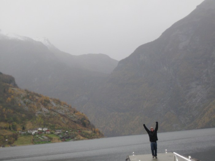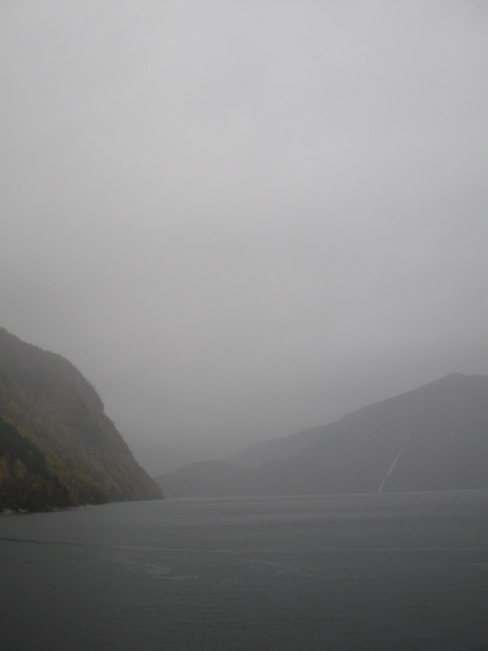 I found the local tourist information office, but, like just about everything else in Geiranger but the grocery store, it was closed. The place was a virtual ghost town now that the tourist season had ended, and I wasn’t too stoked that the weather was rapidly deteriorating with hard rain and strong winds every ten minutes. After asking the clerk at the grocery store, I found out that there was a bus to Ålesund from Geiranger. Happy both with the fact that I wouldn’t have to hike all the way back up the road to Grotli again and that I could make it to Ålesund, I decided to catch the next bus.