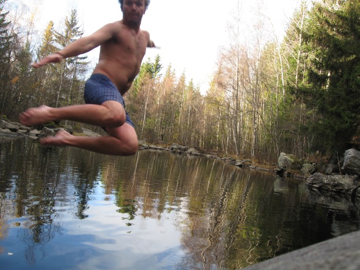 I arrived in Lillehammer early in the morning, and after making sure I knew where the movie premier would be the next night, I took a long hike in the trail system that spider-webs out behind the city. After missing out on a swim in the North Sea at Ålesund the day before, as well as in the river near Lillehammer that morning (it was far too cold), I came across this beautiful pool just above town, and, after wearing the same clothes for the last 5 days that I had both spent a day in skiing and two long days of walking, I knew I needed to immerse myself in the extremely cold and wonderfully refreshing water. It took me two attempts with the self timer on my camera, but this was the best pic for sure.