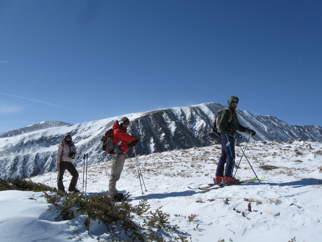 We pulled up to the nearly-full trailhead parking lot around 9:00AM alongside the Pueblo Community College van and almost a dozen other cars. The skies were the bluest of blues, but it was apparent after talking to the guy who had just finished his decent that the winds were more than strong that day. There were 17 in my group, with about 7 on skis and 10 in snowshoes, and everyone followed the rather well-paved trail all the way up to treeline before I got my camera out. Once we arrived at treeline (I’m pretty sure it’s around 12,000 feet, my altimeter’s battery is dead) the wind gusts noticeably picked up and the trail inclined enough to put up the lifter bars on my bindings.