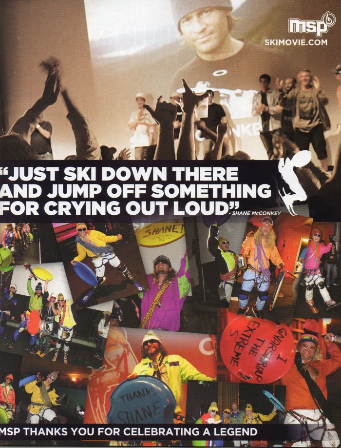 Well, it got my hopes up. Perhaps the photo of me “claiming” with my mouth agape and arms raised to the air earned a full page spread in the Shooting Gallery or something spectacular like that. No, that wasn’t quite the case, but hey, I’m still pretty stoked about getting my face on page 63, especially because it was in honor of Shane McConkey and thanking all of the Saucer Boys for coming out.