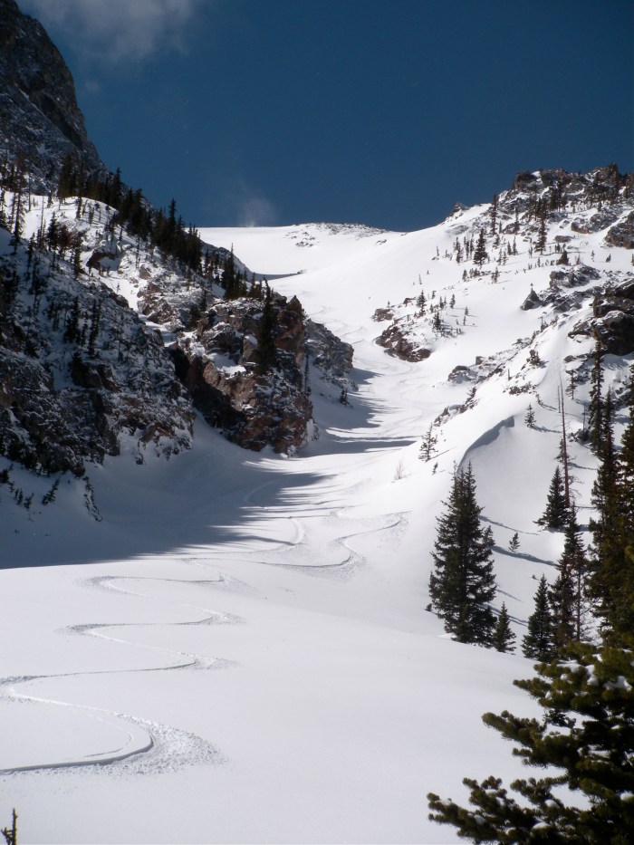 After our ascent of Buffalo Mountain, we clicked into our skis and made some mellow turns to the top of the Silver Couloir. Based on the turns to get to the top, there was a very good chance the snow was going to be very soft the whole way down. It was.