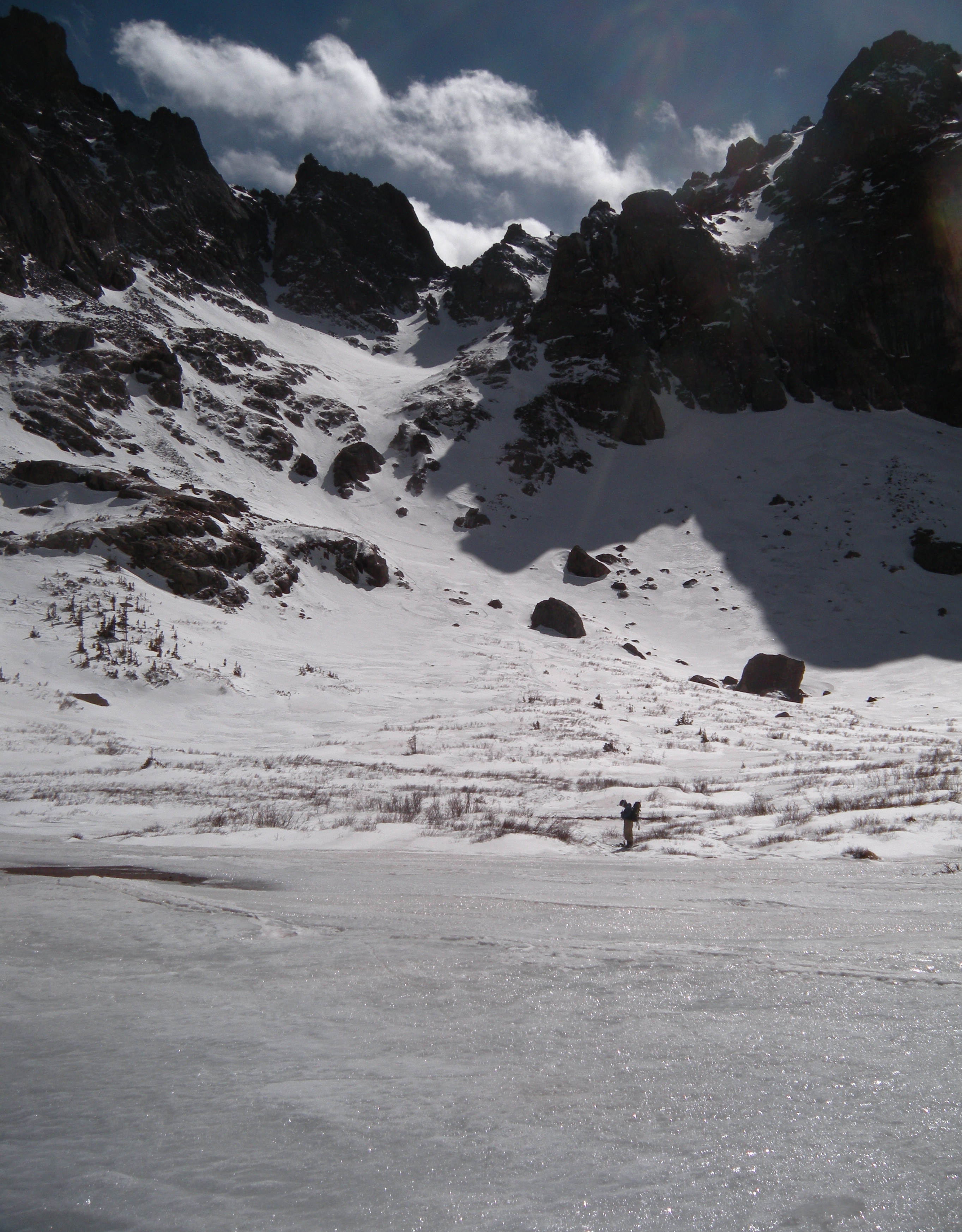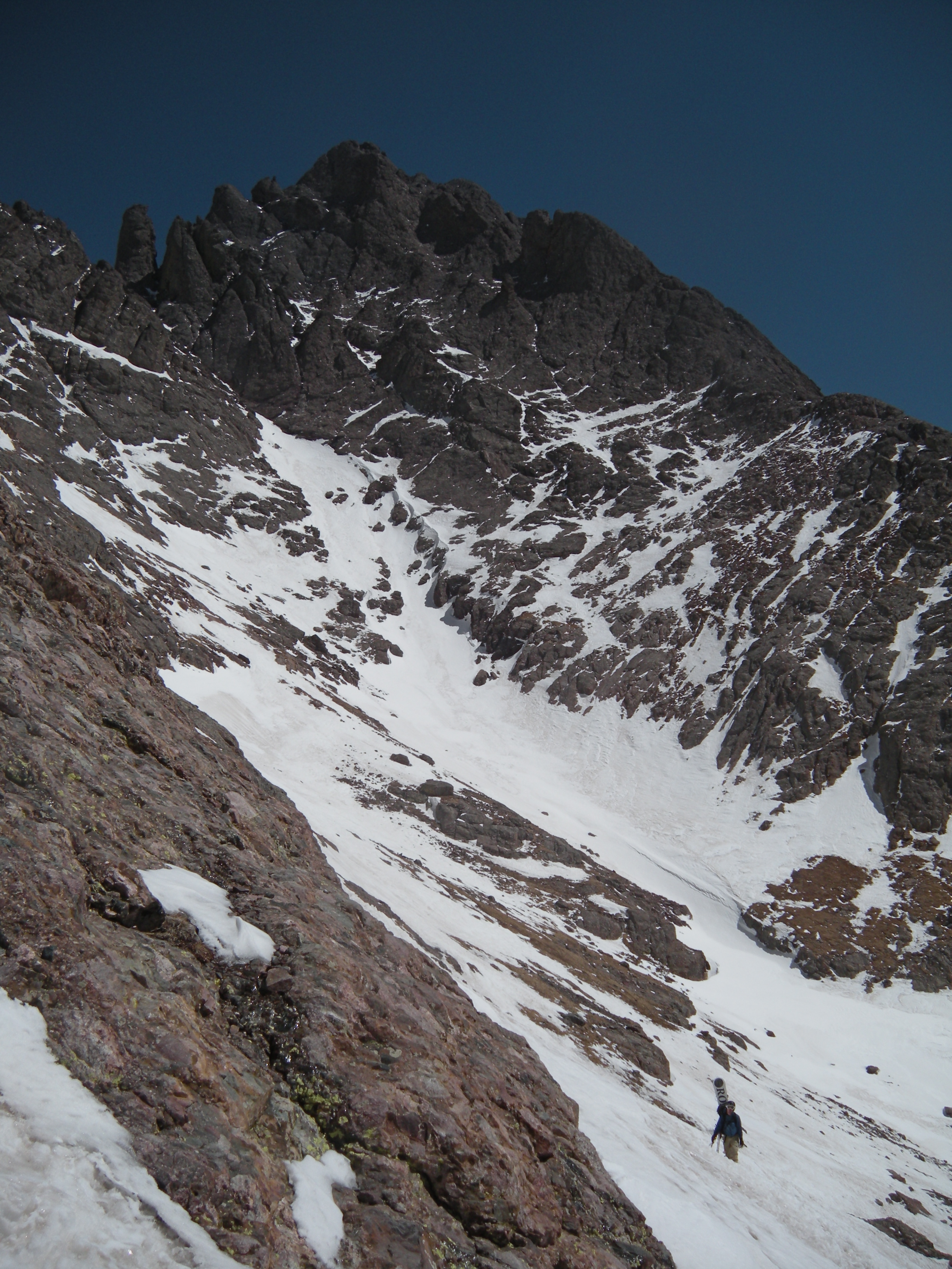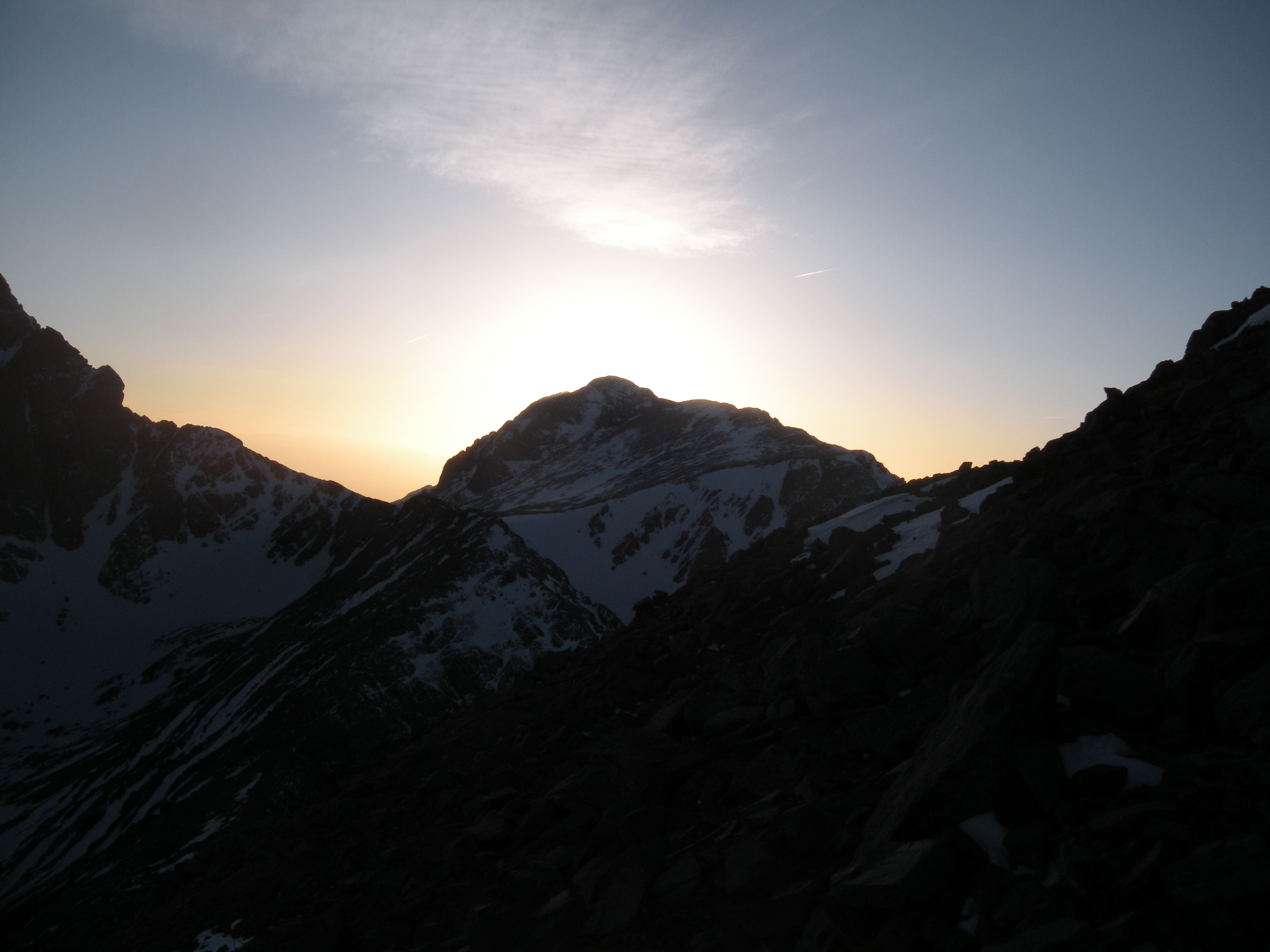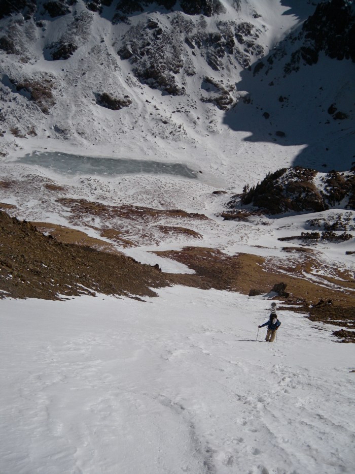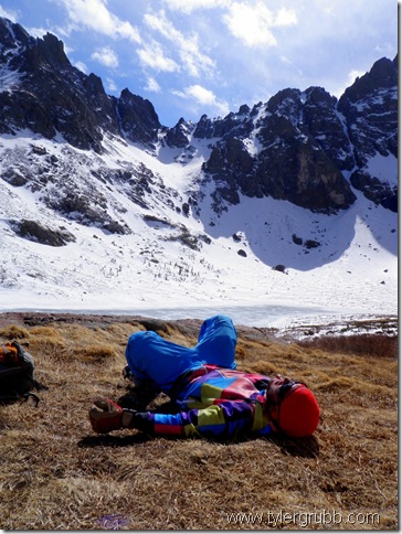 The mighty Crestone NeedleWe were able to snowclimb about 1,000 vertical of Humboldt before hiking the rest in ski bootsThe sun set over Kit Carson and we skied by moonlight down Humboldt.The next day, we ascended Broken Hand Pass to get to Crestone Peak. I lost my helmet, Tyler dropped a water bottle. Not a great start.We started up the peak with the Needle looking on, but we didn't get too far before turning around due to fatigue.After re-ascending Broken Hand Pass, we found this little gem for some great skiing.Yours truly, laying down on some of the only good snow on the trip.Looking back at Broken Hand Pass from South Colony LakeThis picture says it all.