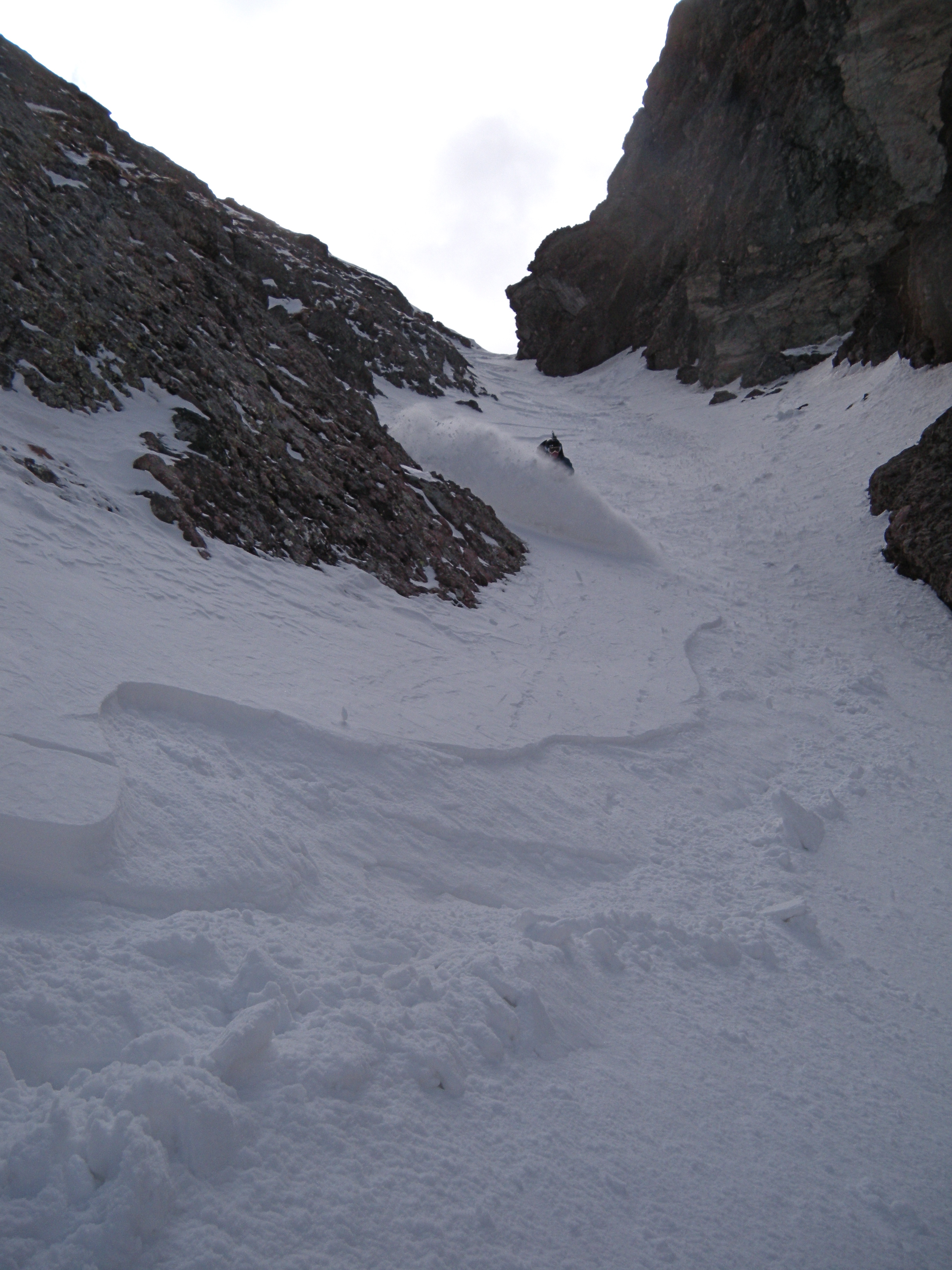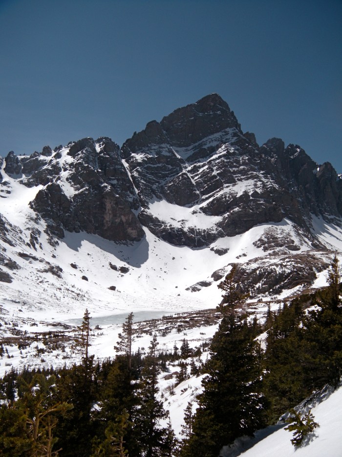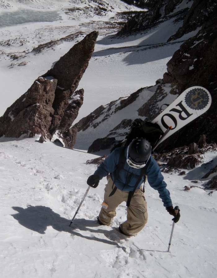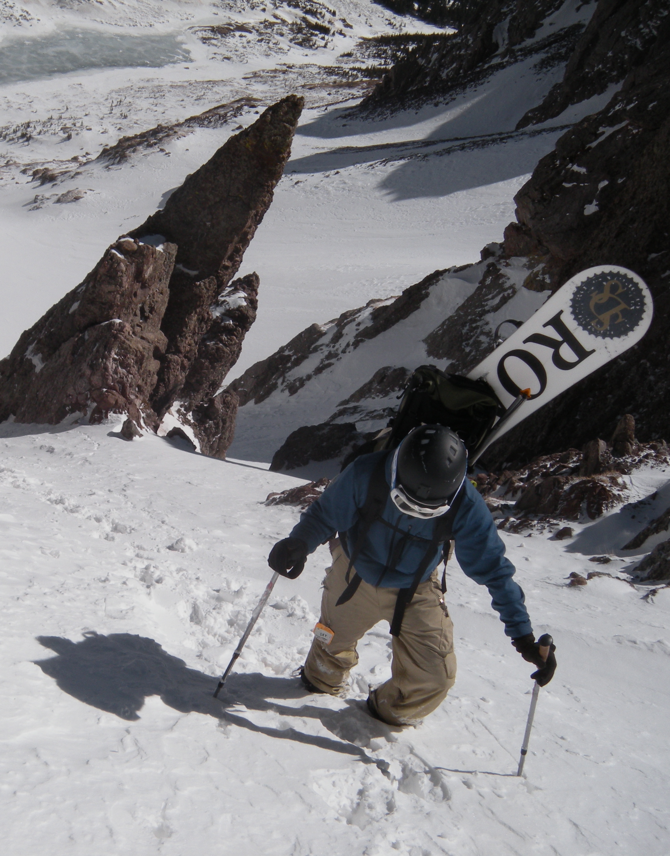 The mighty Crestone NeedleWe were able to snowclimb about 1,000 vertical of Humboldt before hiking the rest in ski bootsThe sun set over Kit Carson and we skied by moonlight down Humboldt.The next day, we ascended Broken Hand Pass to get to Crestone Peak. I lost my helmet, Tyler dropped a water bottle. Not a great start.We started up the peak with the Needle looking on, but we didn't get too far before turning around due to fatigue.After re-ascending Broken Hand Pass, we found this little gem for some great skiing.Yours truly, laying down on some of the only good snow on the trip.Looking back at Broken Hand Pass from South Colony LakeThis picture says it all.