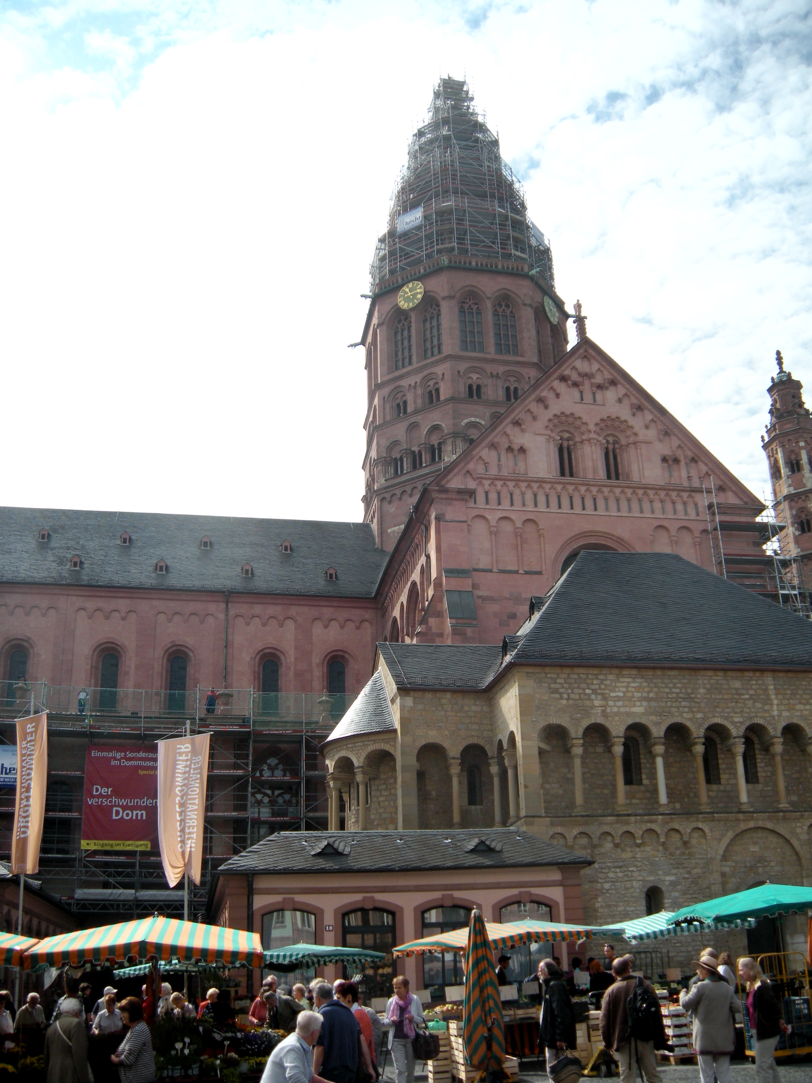 After exploring the Dom, we strolled through the market towards the river while I continually quizzed Julia about historical things. Interesting facts included that Mainz is where Johannes Gutenberg was born, and that no one knows exactly why the city’s symbol is two wheels.