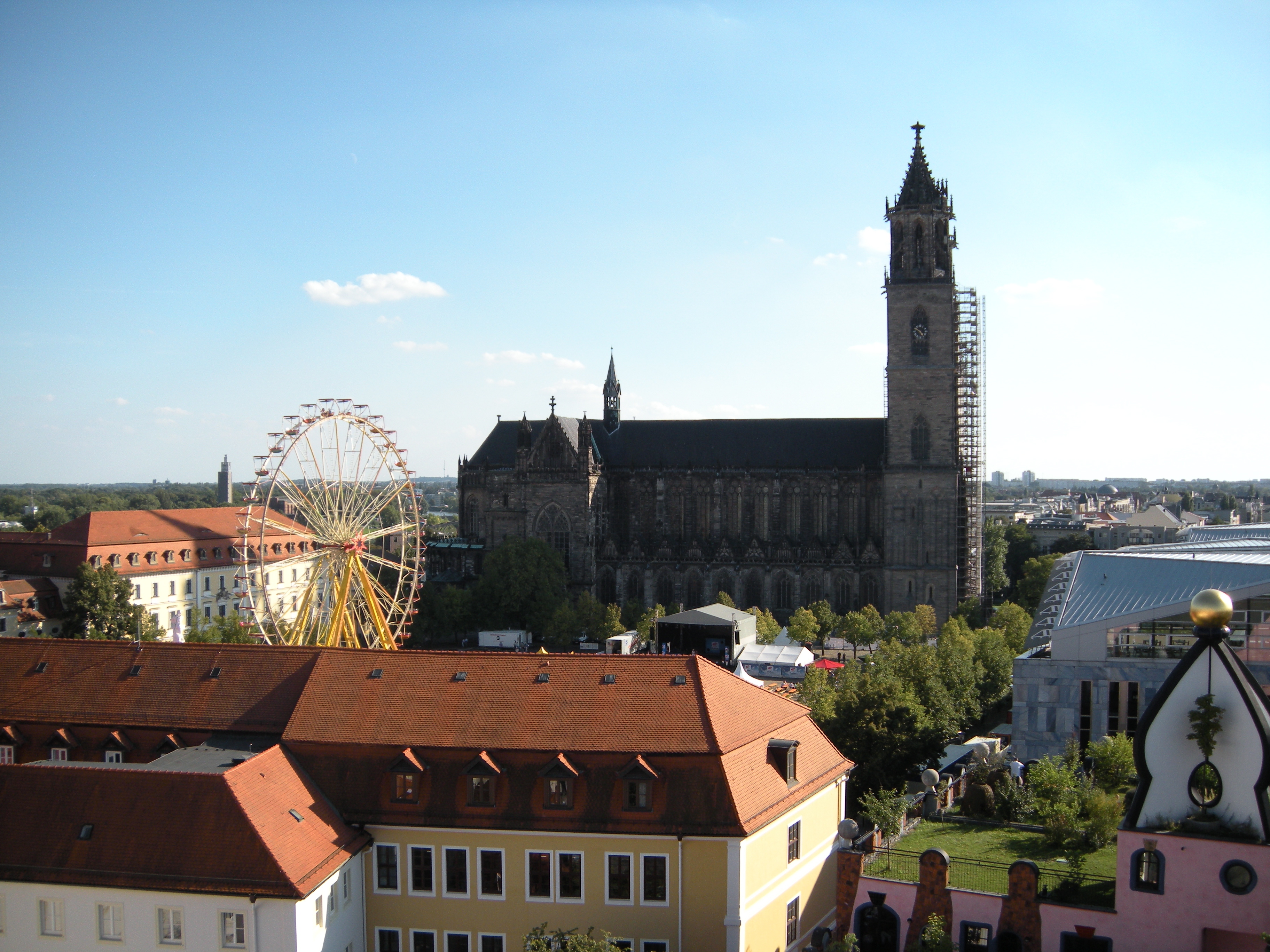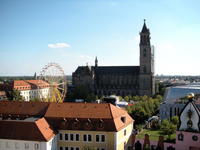 After the dragon show (which we would re-visit later on the trip), we headed to Die Grüne Zitadelle, or the Green Citadel. Oddly enough, the building is actually pink, but because the roof is green, it is called green. As we climbed the tower and looked out at Magdeburg, Maria explained some of the city’s history to me, including how King Otto I lived there for most of his reign as the First Holy Roman Emperor, how the soccer team won a European Championship in the 1980s, and that the massive park in the distance contained the Jahrtausendturm, or the Millennium Tower, which is the largest wooden tower in Germany. Magdeburg is also the capitol of its Bundesländer, or Federal State, of Saxony-Anhalt. Despite its historical prominence, Magdeburg’s reputation, economic strength, and soccer team have decline steadily over the past two decades compared to the rest of Germany.