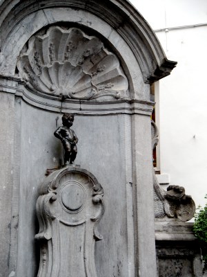 Worth noting, however, is that there are actually two statues of kids peeing in Brussels. Jeanneken Pis is considered to be Mannekin Pis' sister, and is in the back of the alley where you locate the Delirium Cafe. I was told that the shop that had it installed went out of business a while ago, but sometimes she still finds the power to urinate behind the locked gates.